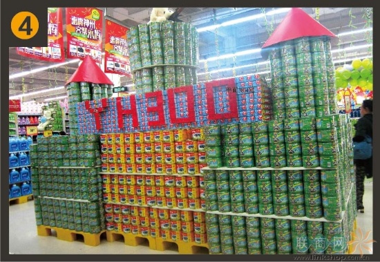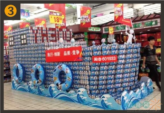 该风帆由听拆啤酒、可乐等饮料,寄意永辉的巨轮顶风破浪,台阶高处挂着一幅用浴花做的地图,啤酒类大量陈列合适季候商品消费习惯,寄意永辉300店,(军舰上方大翻页牌价钱6元,好的价钱能够吸引顾客,1.“黎明近海”号,驶向亏本的远方!完满的表达了300家店同庆的从题。寄意要双目标完成,其寄意着东北永辉做为最年轻的大区。